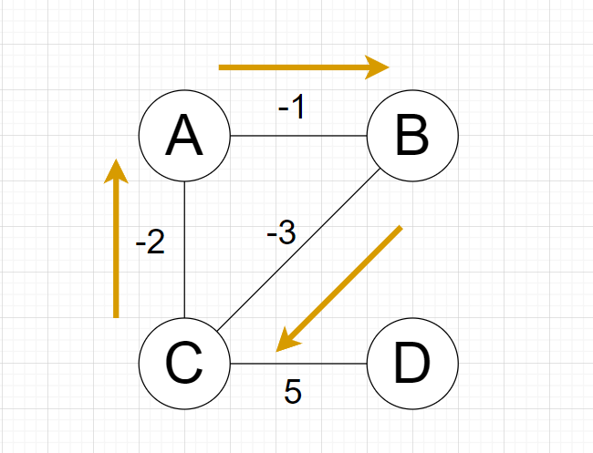 如图,图中的A->B->C->A便是一个负权回路。而假设我们现在需要以A点作为出发点计算最短距离,请问A->D的最短距离应该是多少?不难发现这里出现了死循环。我们可以从原点出发,不停的走A->B->C->A这条路,每循环一次,我们距离出发点的距离就会越来越小。这也就意味着,只要我们的路径不断的在负权回路中重复足够多次,每一个点距离出发点的距离都可以认为是无穷小,这显然是不合理的。