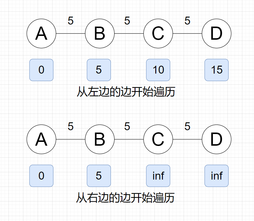 如图,我们发现对于图中的无向图,如果从左边的边开始遍历,实际上遍历一次之后我们就已经得到了最优解。而如果从右边开始遍历,我们就需要遍历3次才能得到最优解。