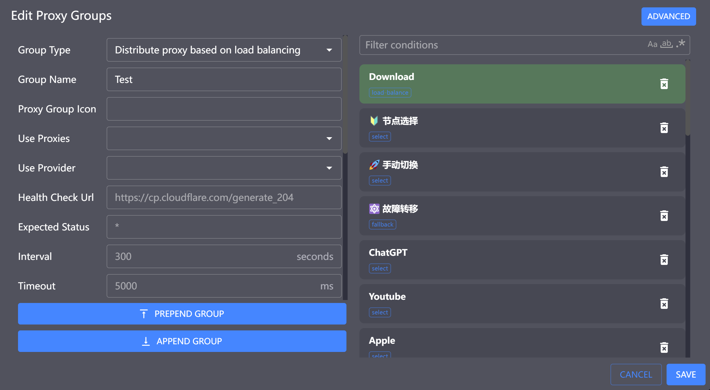 Note: You could use Visualization UI interface to add proxy group and set load-balance type, however, strategy field cannot be configured through the UI and require editing in ADVANCED edit mode (by clicking the “ADVANCED” button at the top-right corner) manually, as shown in the image below: