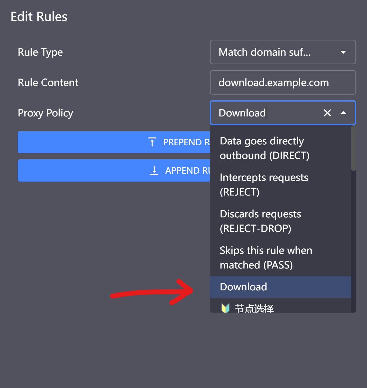 As the image shows, we specify that DOMAIN-SUFFIX: download.nfblogs.com to use the proxy group we just created in previous step.