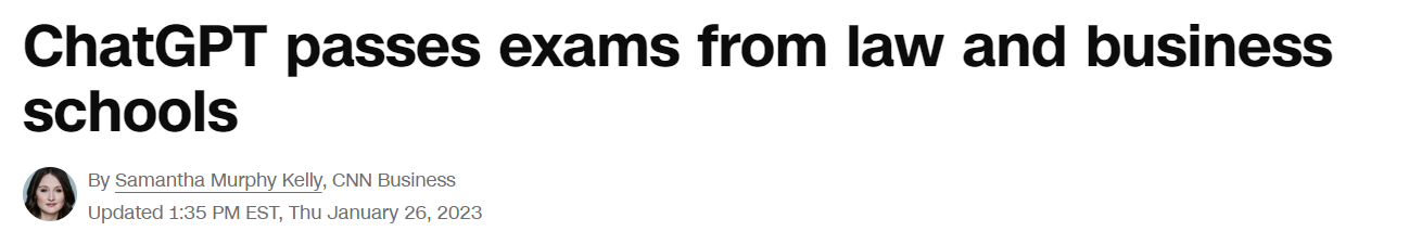 ChatGPT passes exams from law and business schools: https://edition.cnn.com/2023/01/26/tech/chatgpt-passes-exams/index.html