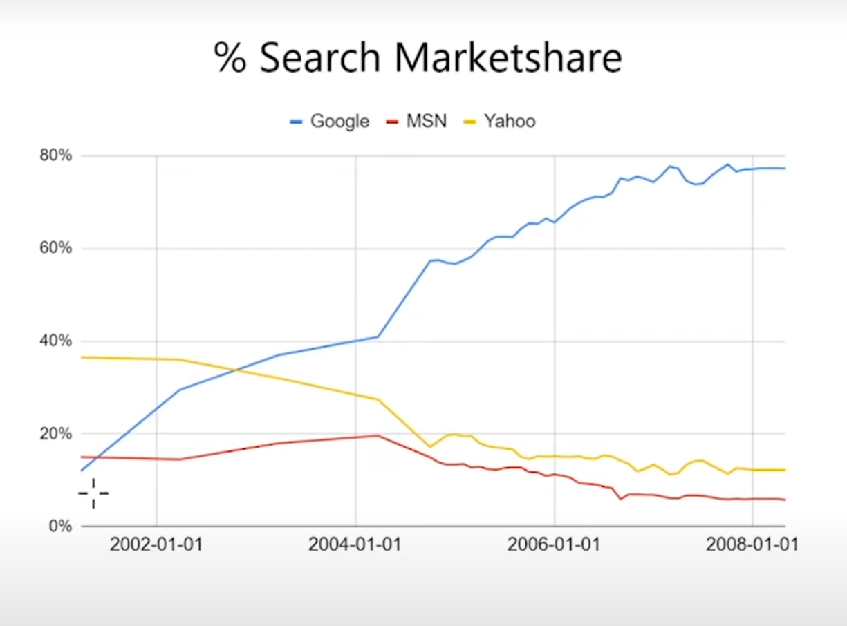 最后的结果大家也已经知道了,雅虎没有同意调皮小屁孩Google的讨价还价,而Google凭借着在搜索结果中展示广告获得了难以想象的巨额收益(上面也提到了,这种收益模式帮助Google一步一步走到了现在的位置),Google搜索也成功从2002年30%左右的市场份额逐渐发展到2008年近的80%。